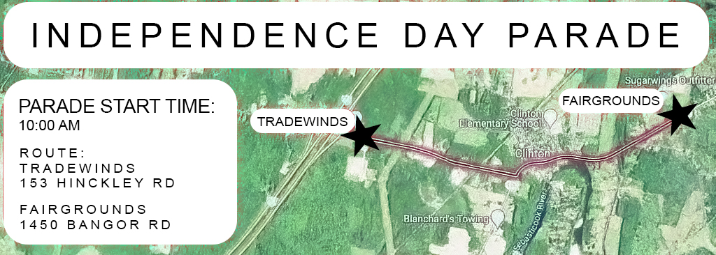 The parade will start at 10:00 AM. The route begins at Tradewinds Market, located at 153 Hinckley Rd inn Clinton, Maine, and ends at Clinton Lions Club Fair Ground, located at 1450 Bangor Rd, in Clinton, Maine.